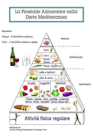 La cosiddetta Piramide Alimentare Mediterranea adottata in Italia si distingue per inserire alla base l’esercizio fisico, e nella sua versione aggiornata del 2015, creata da Sergio Prozzillo e Flavia Soprani, vengono citate anche altre imprescindibili qualità dell’alimentazione, come la convivialità, la stagionalità e un invito consapevole ad evitare gli sprechi.